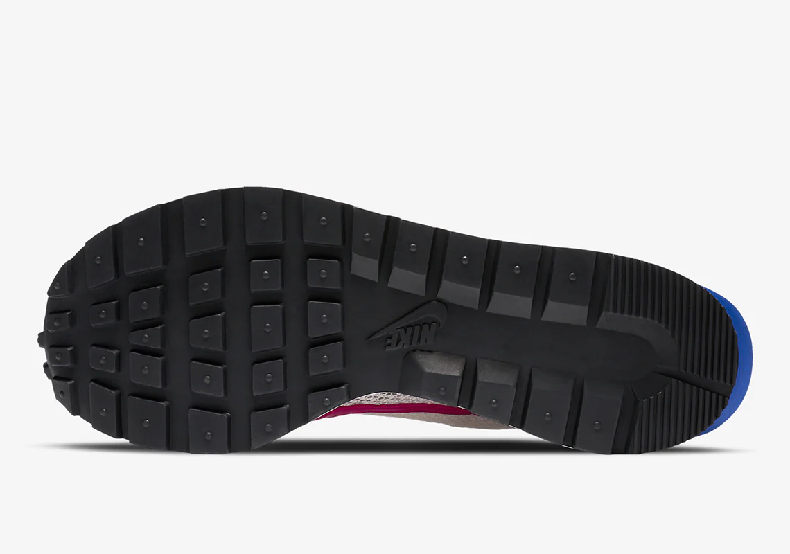 Cette édition se distingue par son coloris explosif Sport Fuchsia / Game Royal, mélange de violet intense et de bleu royal, équilibré par des touches de blanc et de noir. La tige en mesh respirant est renforcée par des superpositions en daim premium, tandis que les éléments signatures de sacai prennent toute leur dimension : double Swoosh, double languette, double lacets et surtout la semelle intermédiaire empilée, conférant à la paire une allure futuriste et sculpturale.