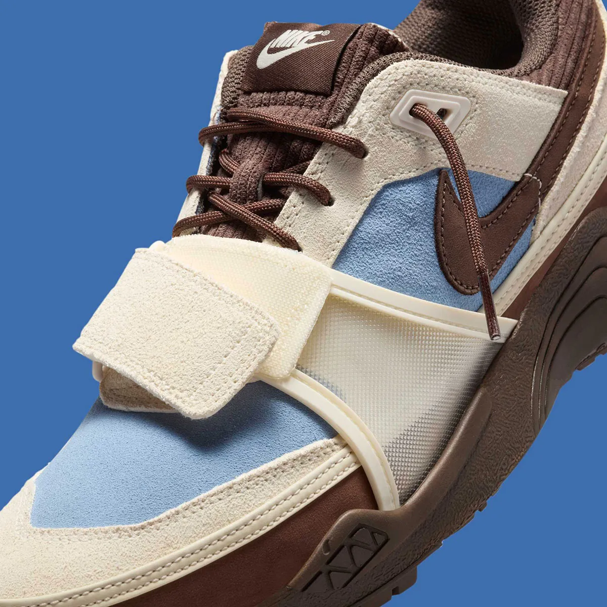 La Nike Zoom Field Jaxx Travis Scott “Leche Blue” marque une nouvelle étape dans la collaboration entre Nike et Travis Scott, mêlant inspiration trail, innovation technique et esthétique expérimentale. Imaginée comme une fusion entre la performance outdoor et la mode urbaine, cette paire affiche une tige en toile et mesh beige “Leche”, contrastée par des accents bleu glacier “Blue Tint” et des détails noirs sur la semelle et les renforts. Le swoosh inversé, signature du rappeur texan, et les éléments en caoutchouc ondulés sur la midsole confirment le caractère avant-gardiste du modèle.
