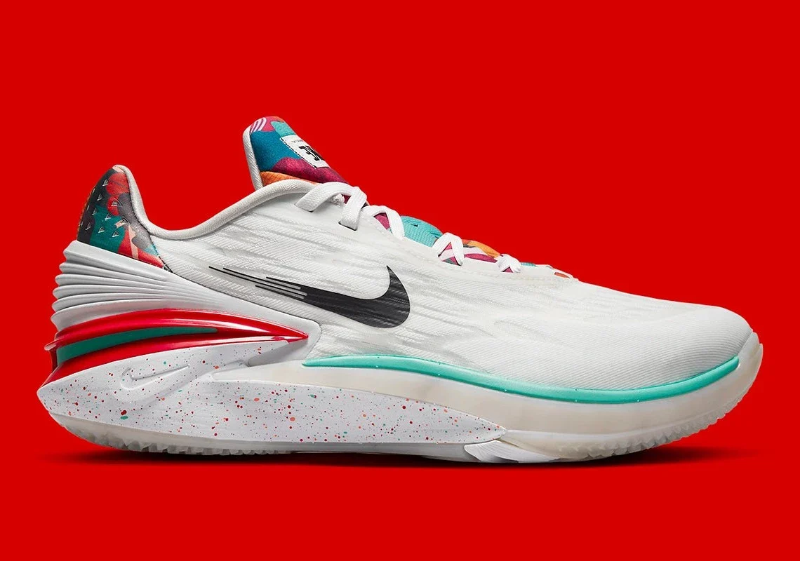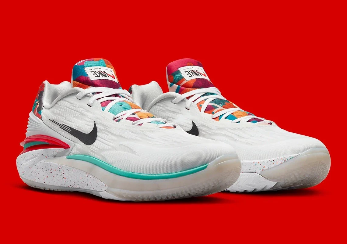 Avec une fine bande sarcelle à l’avant-pied, la partie inférieure du contrefort moulé du talon est entourée d’une bordure rouge vif. Coordonnant les teintes de la paire dans un arrangement moucheté le long de la semelle intermédiaire, un Swoosh noir de jais s’interpose au milieu du pied avant qu’un amalgame abstrait de motifs de basket-ball et de couleurs vives ne vienne remplir la construction de la languette et la languette perforée du talon.