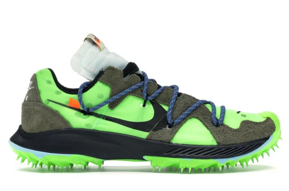 Abloh ajoute également un système de laçage auxiliaire audacieux et le détail le plus distinctif du modèle, la semelle extérieure en caoutchouc à pointes. Ce coloris comprend une base en textile Electric Green avec des superpositions de suède aux accents olive et noir pour la marque Swoosh et la semelle intermédiaire. La semelle à crampons est assortie à la teinte vert néon de la partie supérieure avec des touches marbrées de bleu vif mélangées. La signature Off-White zip-tie apparaît en vert pour la touche finale. La Terra Kiger 5 « Electric Green » de Off-White x Zoom est sortie le 24 juin 2019.