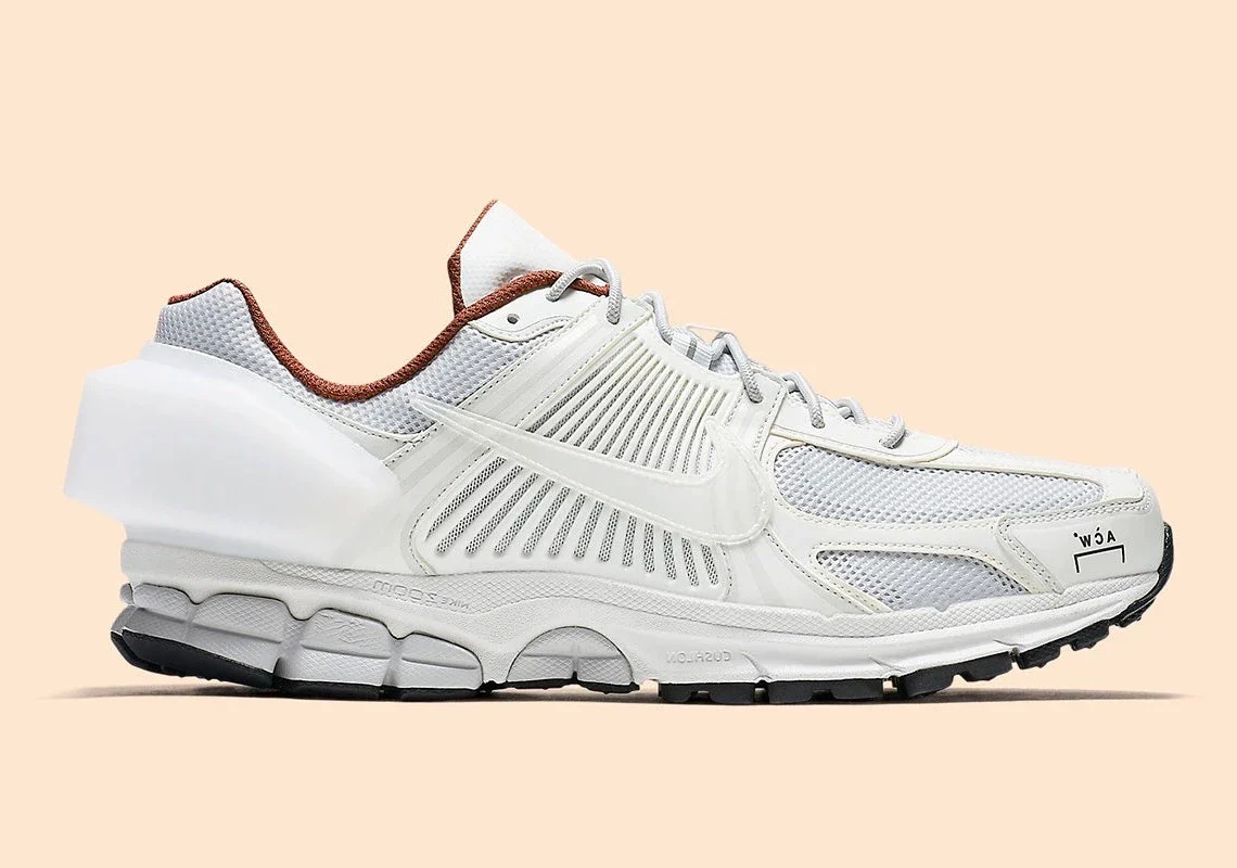 La base de la tige adopte un coloris “Sail” (écru clair), épuré et lumineux, typique de l’esthétique ACW*. Les médecins matériaux – mesh technique et suède premium – sont assemblés avec soin, soulignés par des accents noirs et des touches gris “Flat Pewter” qui véhiculent la signature industrielle et conceptuelle d’ACW*. Le talon est orné d’un patch surélevé structuré, rappelant les finitions architectural-tech souvent présentes chez ACW*.