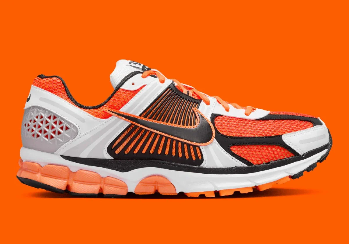 La Nike Zoom Vomero 5 Total Orange s’impose comme une explosion de couleur sur l’emblématique silhouette running-heritage de la gamme Vomero. Avec sa palette « Total Orange / Black / White / Metallic Platinum », elle affiche une tige principalement orange vif, rehaussée de touches noir profond (Black), de détails blancs nets (White) et d’accent métallisé « Metallic Platinum » qui ajoutent du relief et du luxe.