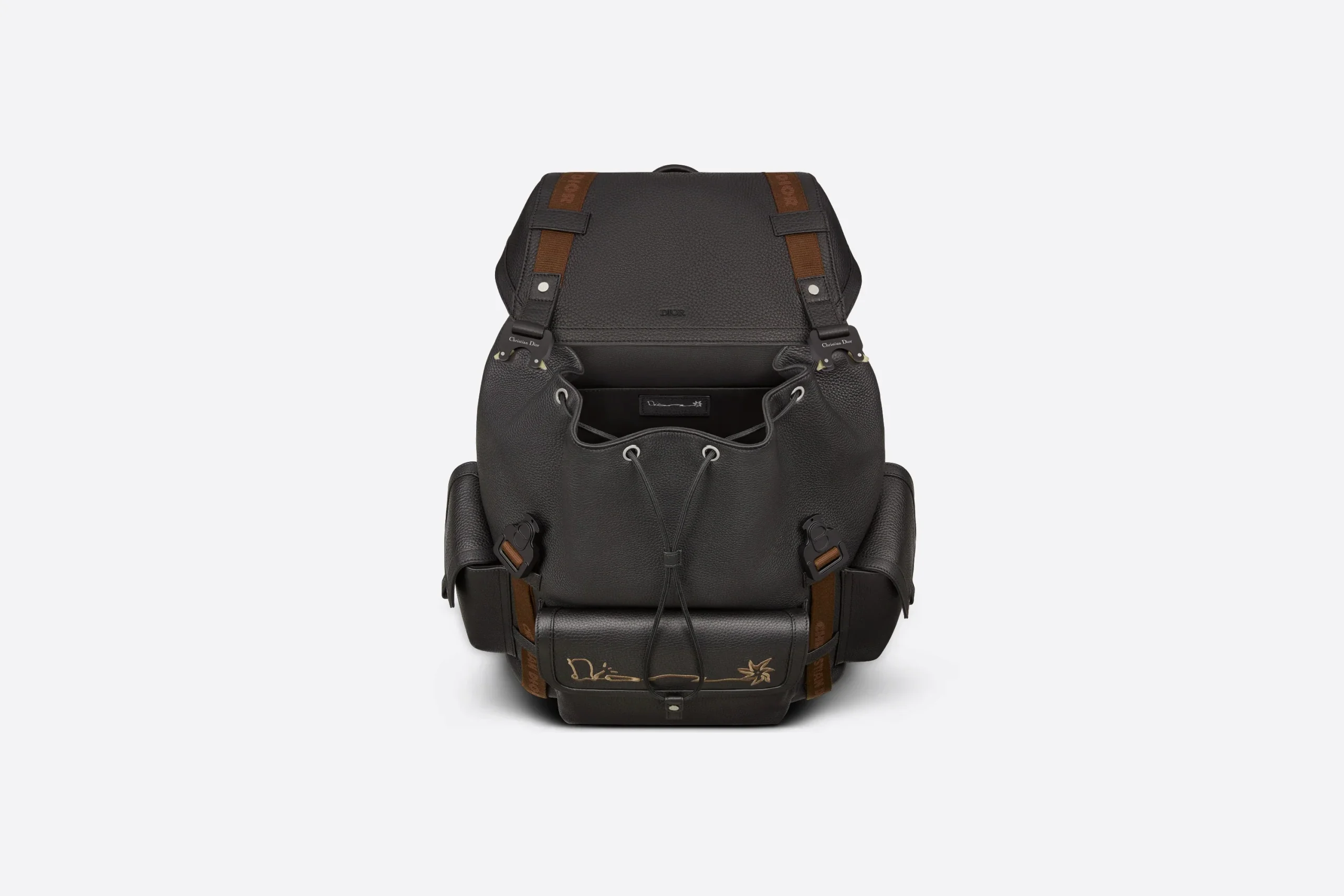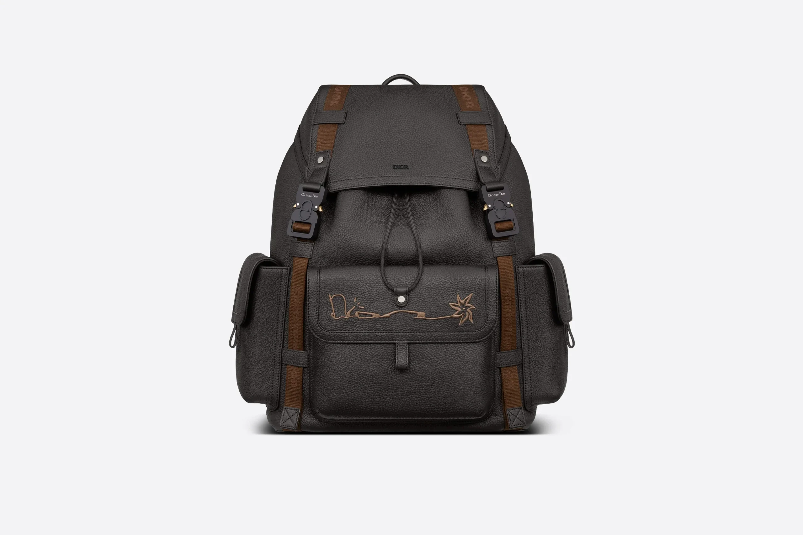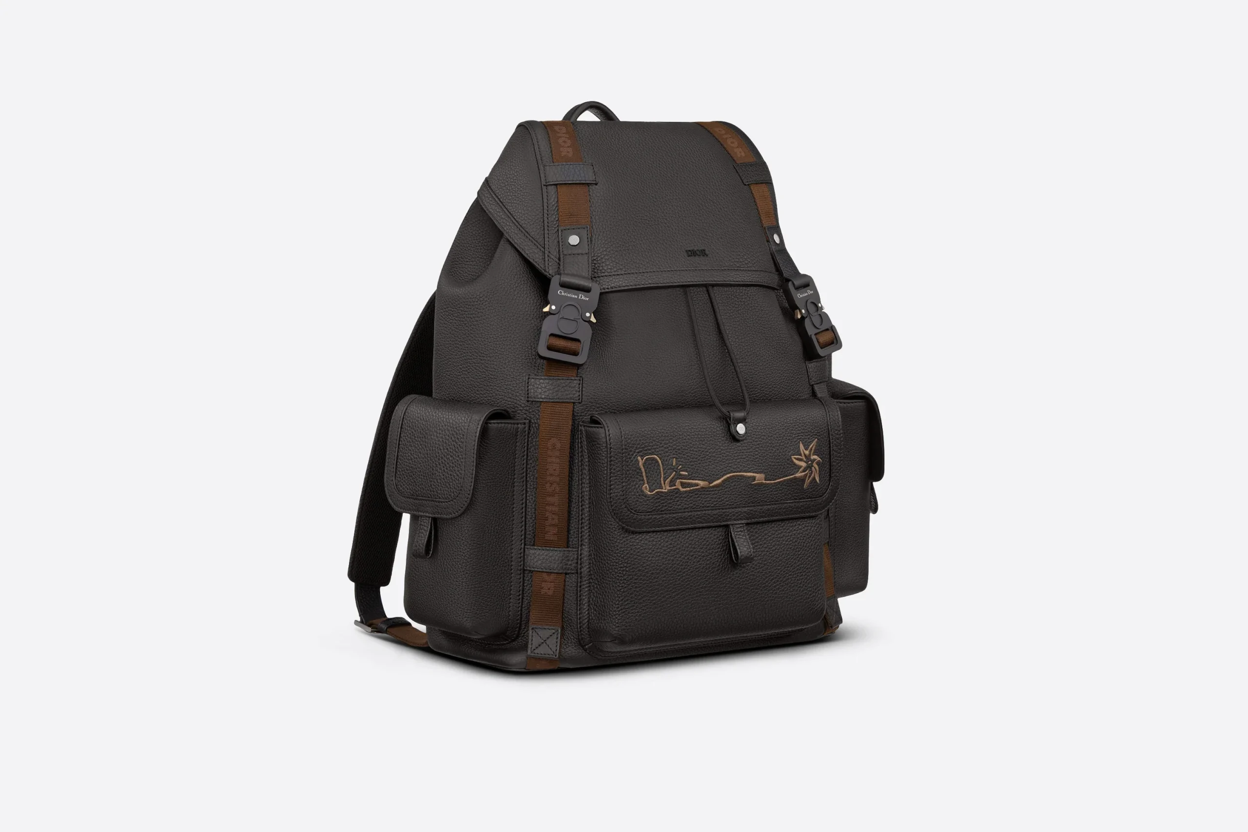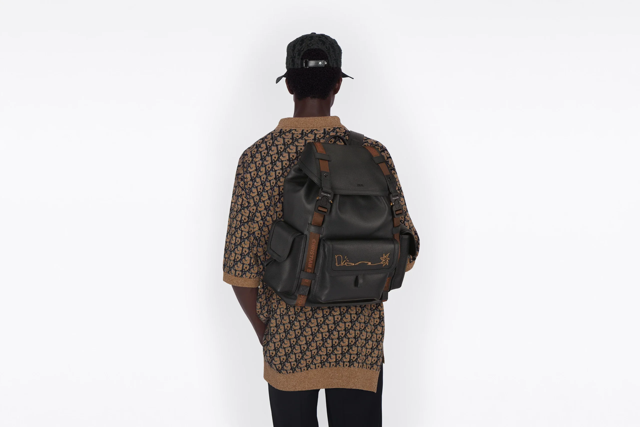 Nouveauté de la saison, le sac à dos Dior Hit The Road est issu de la collaboration exclusive avec CACTUS JACK. Confectionné en cuir de veau grainé noir, il est sublimé par la signature CACTUS JACK DIOR brodée à l’avant. Habillé de deux bandes en jacquard de nylon Christian Dior, ce modèle se dote d’un compartiment principal spacieux, d’une large poche à rabat à l’avant, ainsi que de deux poches à rabat sur les côtés. Ce sac à dos fonctionnel sera la touche finale à toutes vos tenues casual.