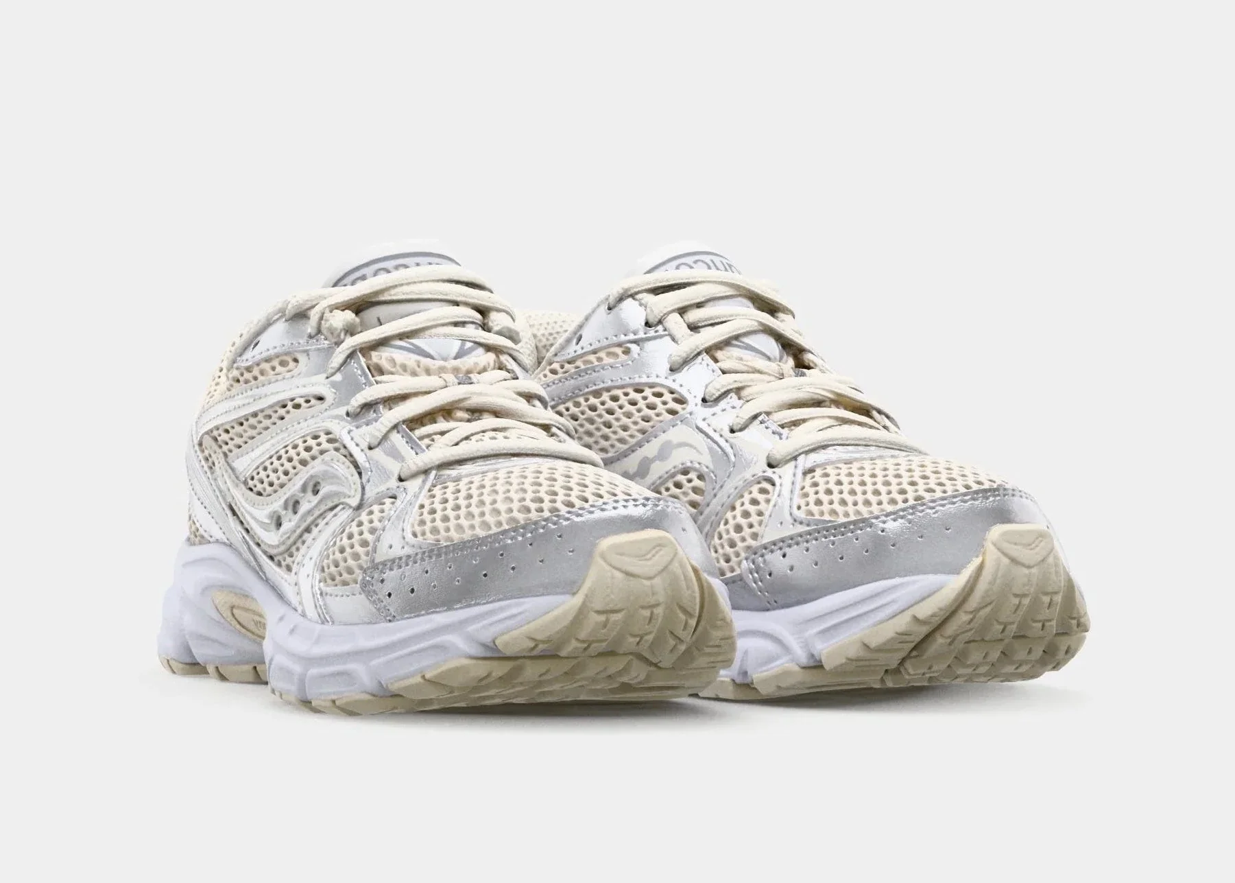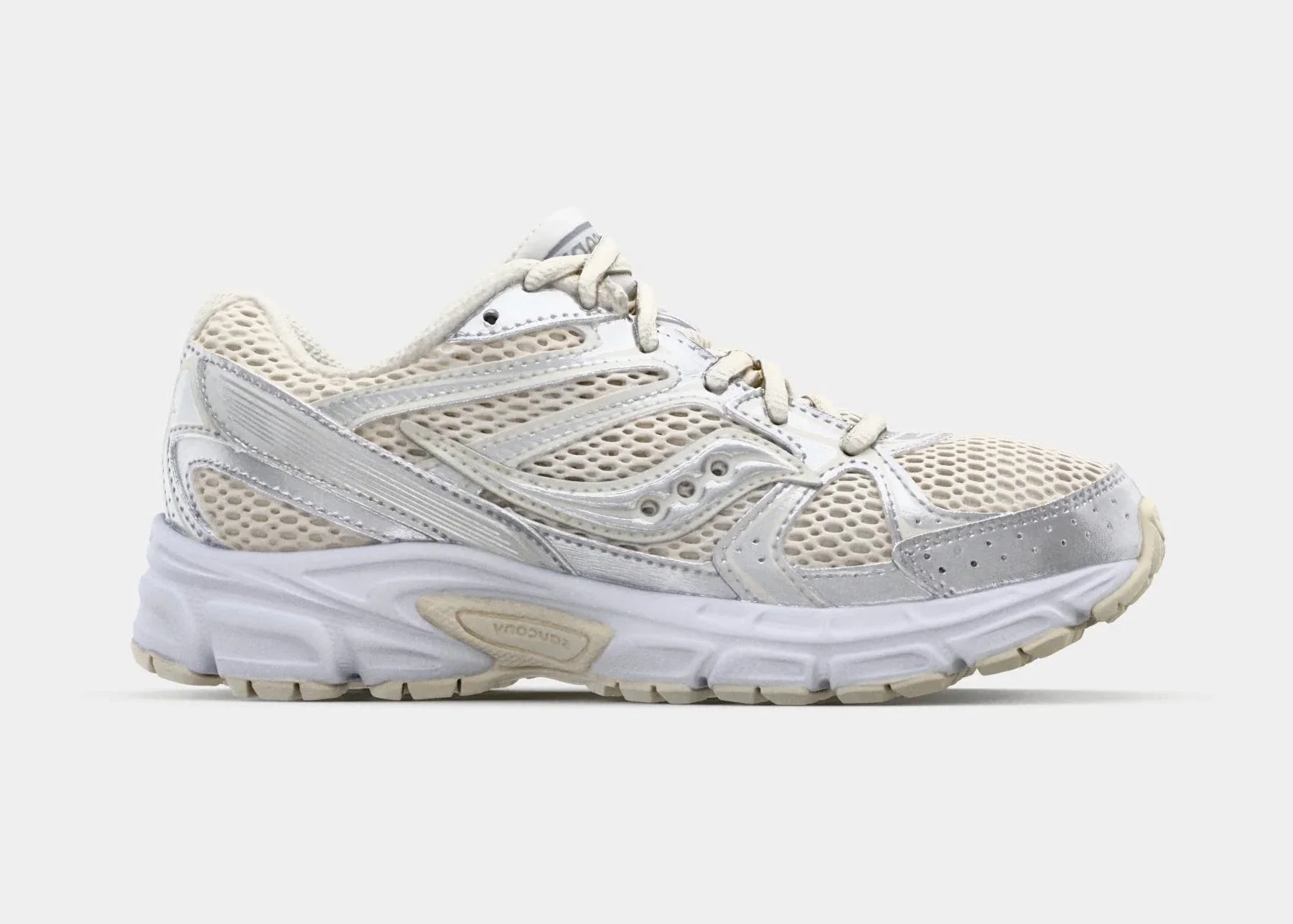 La Saucony Ride Millennium Cream Silver revisite l’esthétique running des années 2000 dans une version raffinée et contemporaine, entre technicité et minimalisme élégant. Sa tige en mesh respirant crème est sublimée par des superpositions métalliques argentées et des détails beiges ton sur ton, créant une palette douce et sophistiquée. Les lignes dynamiques et la structure légère de la silhouette rappellent l’héritage performance de la gamme Ride, tout en s’inscrivant dans les tendances actuelles du rétro-tech.