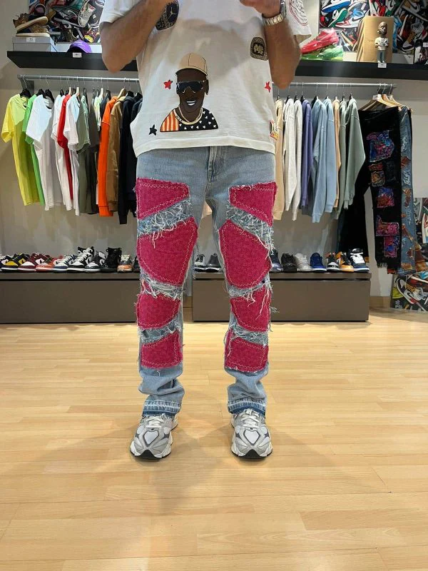 Plongez dans un style audacieux avec le Denim Carpenter Pink, une pièce phare de la collaboration entre Thomas Déthelot et Global Sneakers. Ce jean unique mêle l’énergie des empiècements patchwork rose vif avec la solidité d’un denim bleu classique. Les découpes structurées et les détails usés apportent une touche rebelle et originale, pour un effet visuel saisissant. Fabriqué à partir de denim et de tissus patchwork 100% coton, ce jean allie style et confort, idéal pour ceux qui souhaitent se démarquer avec audace.